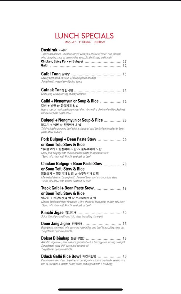 Our specialty boxed lunch set with our house special soo-won galbi, japchae glass noodles, white rice, soup of the day, kimchi, beef bulgogi dumpling, and banchan side dishes. *No substitutions